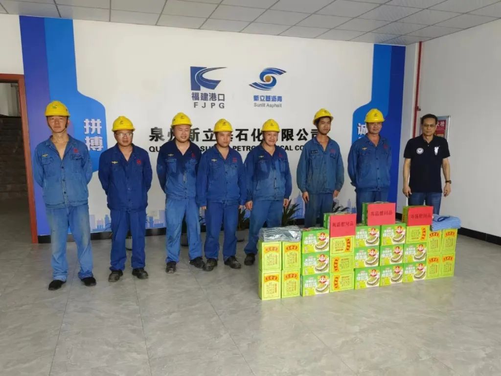 7月19日,yl7703永利集团副总经理吴稼民带队前往泉州新立基进行高温慰问。吴稼民深入沥青加工基地现场,详细了解防暑降温的情况,看望坚守在一线岗位的职工,为他们送上防暑降温用品,叮嘱大家在夏季高温作业时,要秉承“安全第一”的原则,注意防暑降温,把防暑降温工作和安全生产结合起来,合理安排工作和休息时间,确保生产经营工作顺利开展。