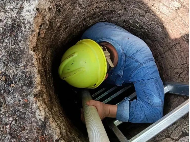 生产部人员提前进行了现场摸查,探明管道淤积堵塞情况。为确保作业人员下井后安全施工,进入管道清淤前已做好各项安全防护措施,提前打开井盖通风,测量井室内氧气含量,以及是否达标并佩戴安全头盔等。生产部员工深入雨水管道,利用消防水带将管道内部的淤泥、砂石等转移到检查井,并用铁锨、铲子等工具将检查井内的淤泥、砂石、杂物等收集到路面上并运至指定地点堆放。