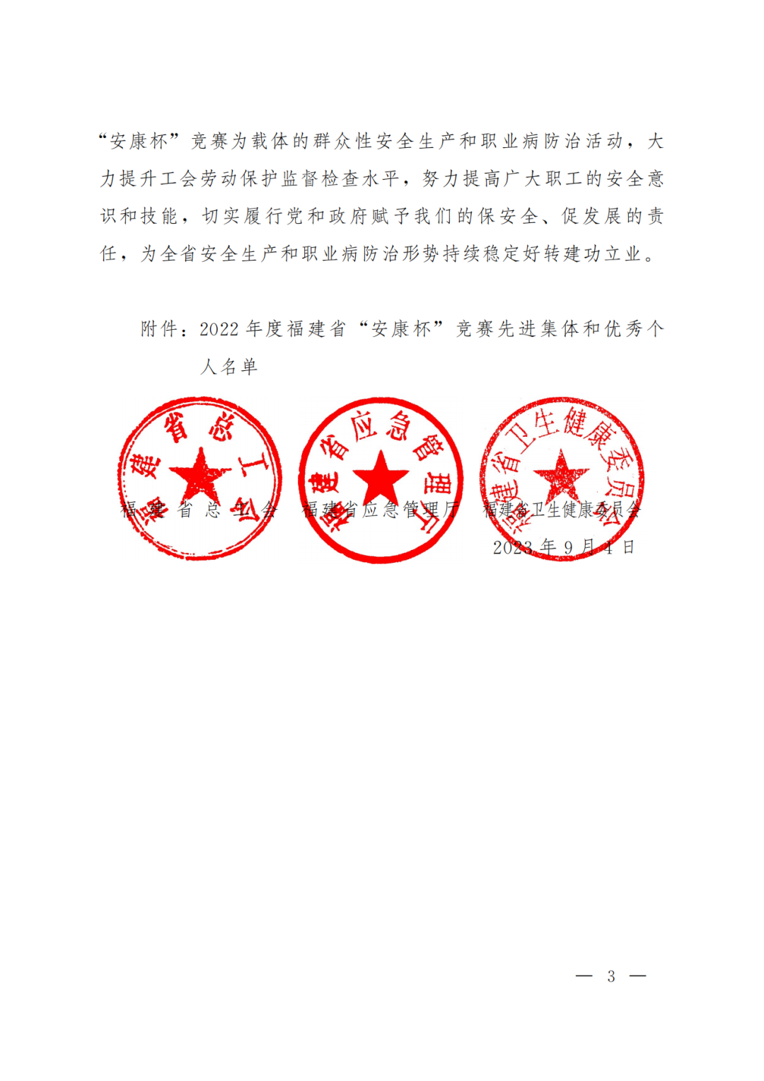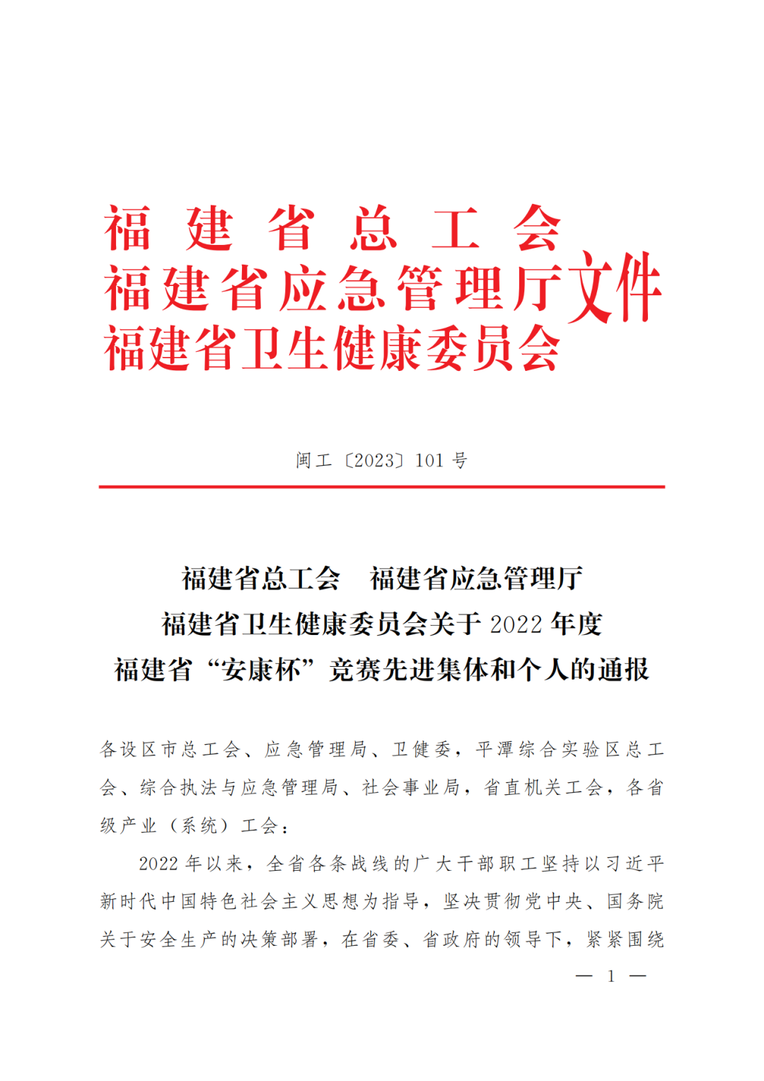近日,福建省总工会、福建省应急管理厅、福建省卫生健康委员会联合印发《关于2022年度福建省“安康杯”竞赛先进集体和个人的通报》,yl7703永利集团荣获福建省“安康杯”竞赛先进单位荣誉。