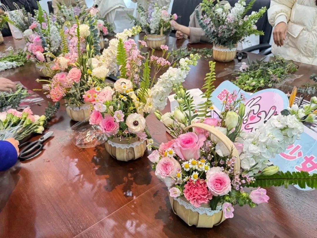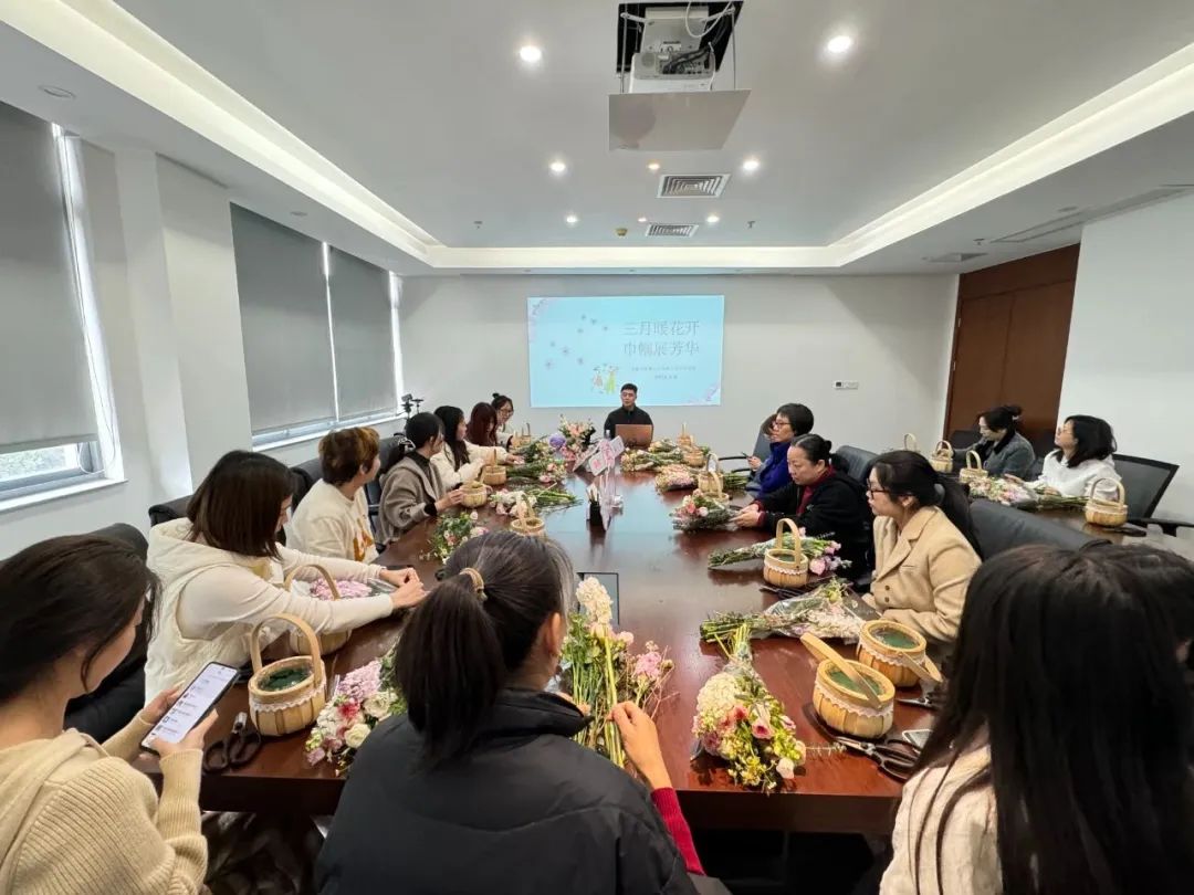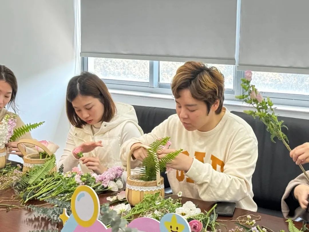 活动邀请花艺师为大家介绍插花的基本知识、鲜切花日常养护知识与所用花材的简介,帮助女职工们深入了解花艺美学,并利用现有花材为大家示范了插花的技法与搭配原理。随后大家在老师带领下开始动手实践,根据材料和主题,发挥着想象力和创造力制作自己的花艺作品,体验制作花艺的乐趣和成就感。
