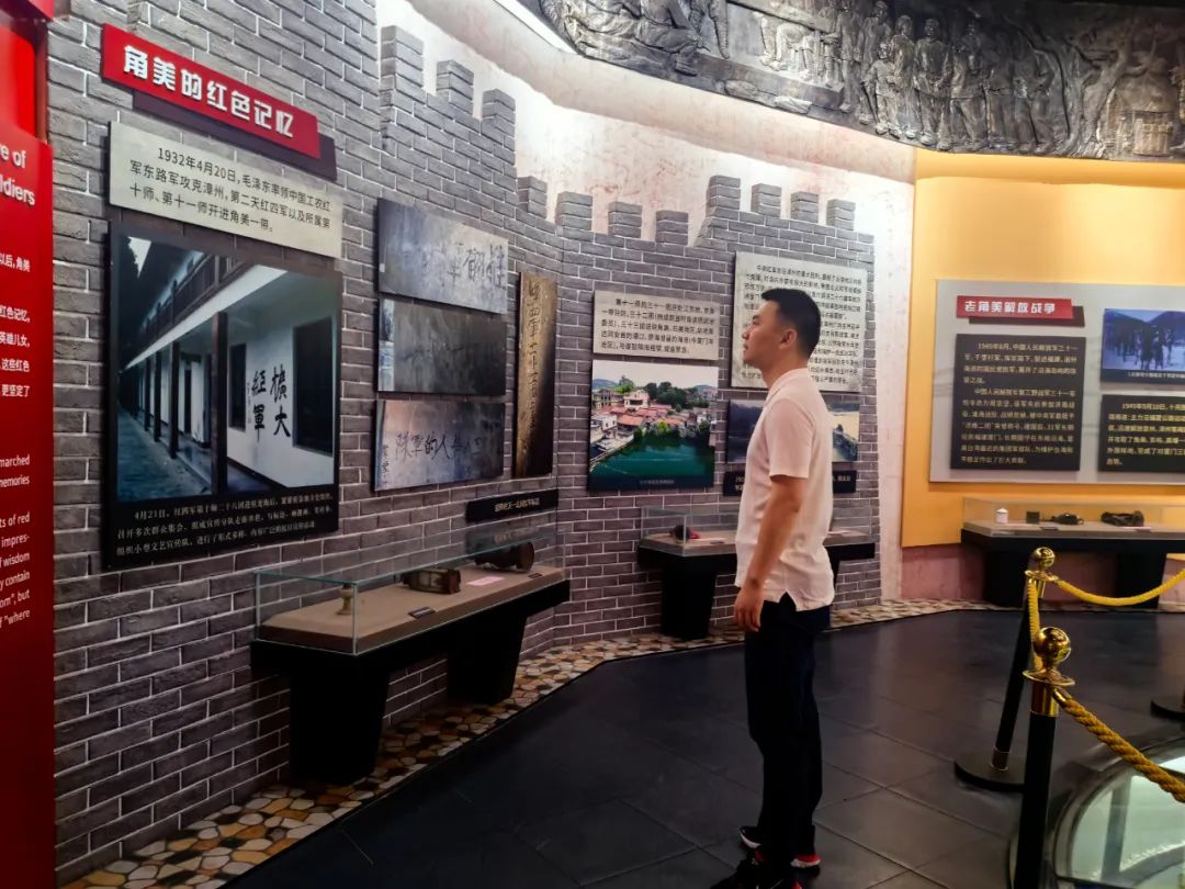 角美红色文化馆是漳州市台商投资区的红色文化教育示范基地,由南门村的三个旧粮仓改造而成,该馆以厦鼓战役为主线,以南台船管大队支前事迹为脉络,以实物、图文、浮雕为载体,结合半场景演绎、多媒体播放等现代布展手段,再现以张水锦为代表的角美儿女不怕牺牲,踊跃支前、摇船参战的情景。全体党员逐一参观了“烽火连角美”、“英雄南门人”、“胜利的赞歌”等展厅,了解了解放角美、厦鼓战役以及漳厦战役的历史。通过追寻先烈的奋斗足迹,汲取精神力量,传承红色基因,感受纪律严明的光荣传统,进一步锤炼了党员干部的党性修养。