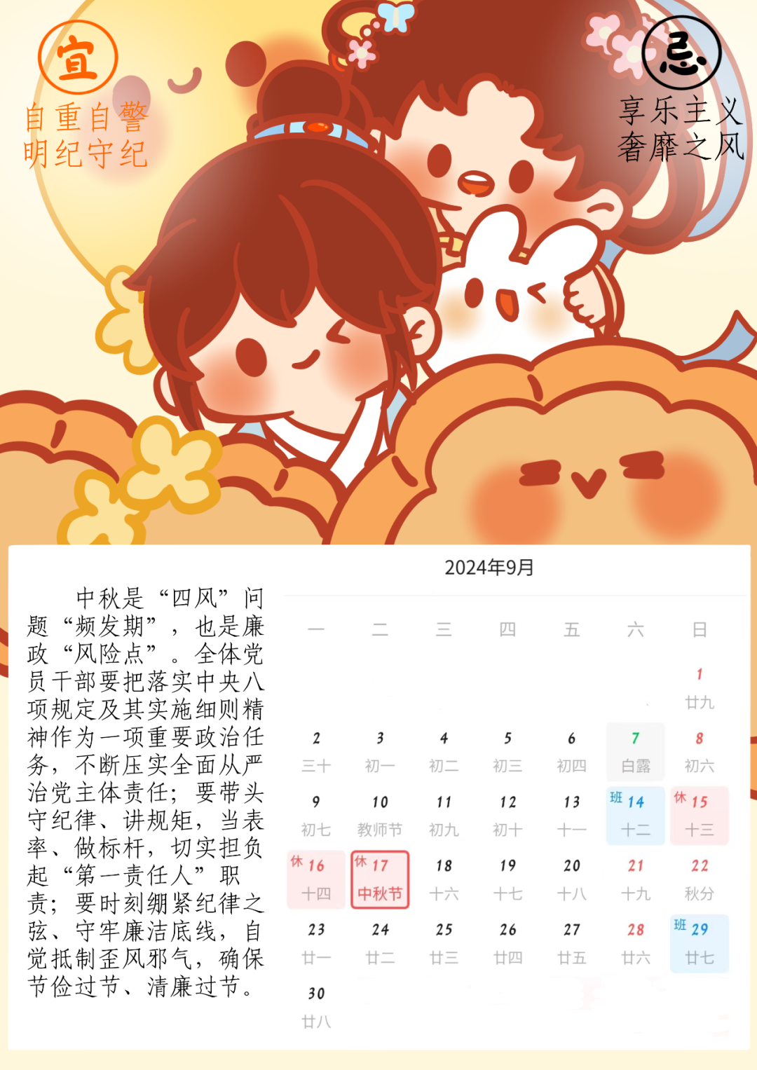 中秋是“四风”问题“频发期”,也是廉政“风险点”。全体党员干部要把落实中央八项规定及其实施细则精神作为一项重要政治任务,不断压实全面从严治党主体责任;要带头守纪律、讲规矩,当表率、做标杆,切实担负起“第一责任人”职责;要时刻绷紧纪律之弦、守牢廉洁底线,自觉抵制歪风邪气,确保节俭过节、清廉过节。
