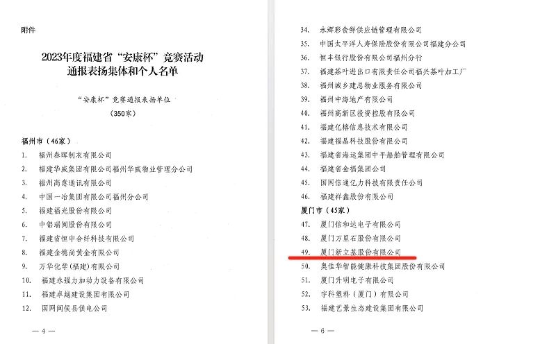 近日,福建省总工会、福建省应急管理厅、福建省卫生健康委员会联合印发《关于对2023年度福建省“安康杯”竞赛活动进行表扬的通报》,yl7703永利集团荣获福建省“安康杯”竞赛通报表扬单位荣誉,公司已连续三年获得该项荣誉。