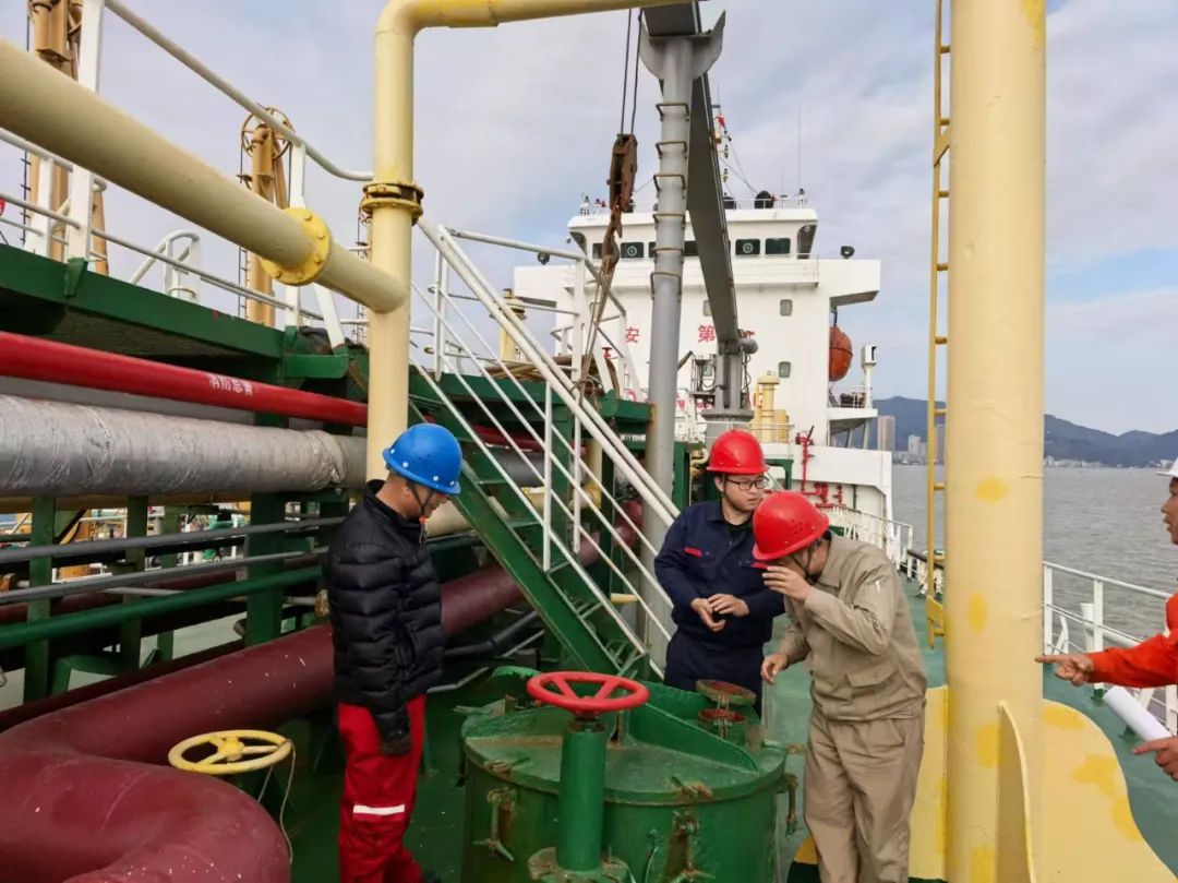 在古衫油库码头泊位上,公司业务团队在前期有效沟通协作的基础上,主动跟进船舶装卸工作,凭借着港口装卸工人的专业技能,燃料油被快速、准确地吊装至船舶货舱,整个装船过程井然有序。同时,公司质量检验人员全程监督,严格把控燃料油质量,确保符合客户要求。航运公司船员的积极配合,也为燃料油的安全存储和运输提供了有力保障。