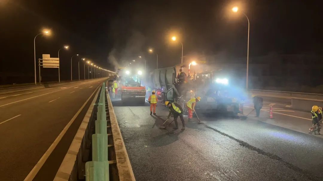 施工作业时,同步摊铺机与施工员有序协作,在短时间内即可完成大面积的铺设,有效降低了路面的施工封闭期;铺设完成后的路面,平整光洁,视觉效果极佳,仿佛给G1505 福州绕城高速铺上了崭新的 “黑色绸缎”。该技术的运用可有效提升原有路面的抗车辙性与耐久度,为道路的长久稳定运行保驾护航。