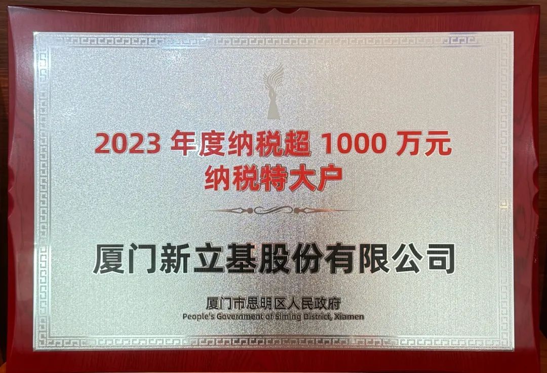 荣获厦门市思明区人民政府授予的“2023年度超1000万元纳税特大户”荣誉称号。