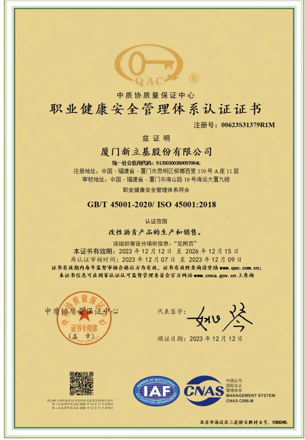 公司顺利取得ISO三体系(ISO9001质量管理体系、ISO14001环境管理体系、ISO45001职业健康安全管理体系)认证证书。