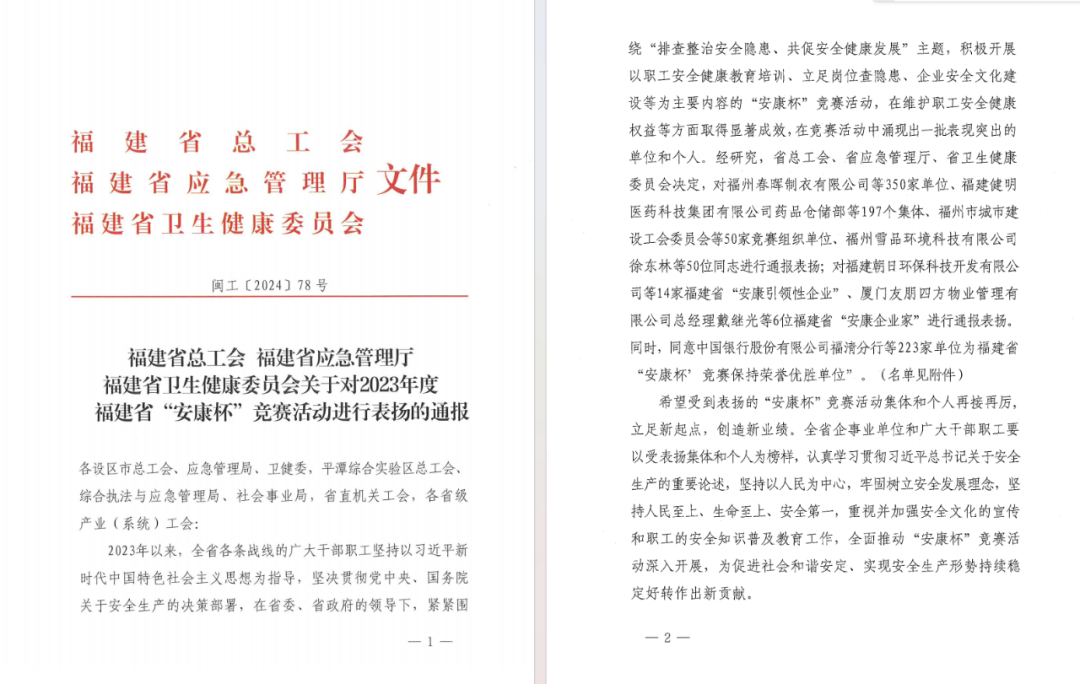 连续三年获得福建省“安康杯”竞赛通报表扬单位荣誉。