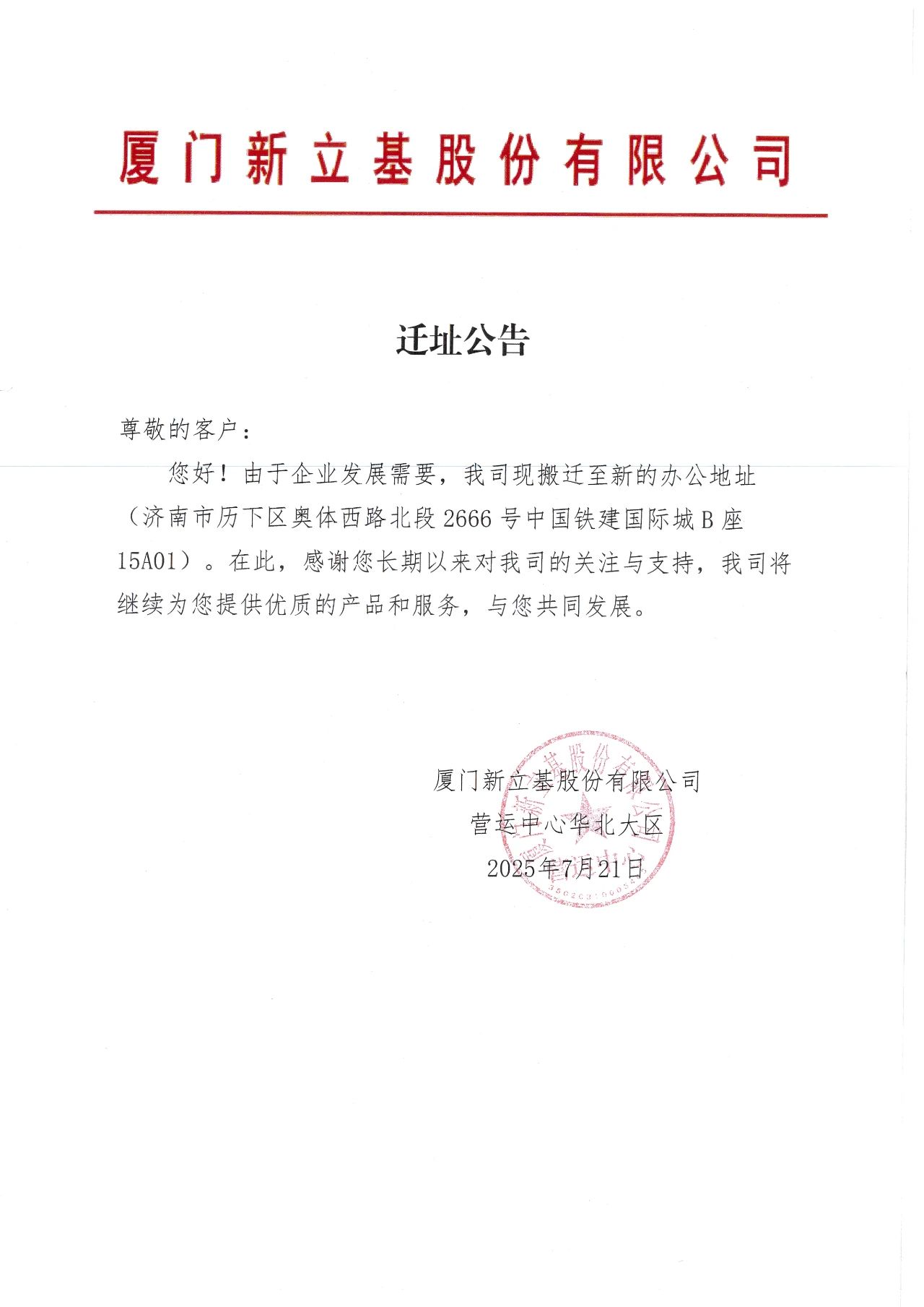 尊敬的客户:您好!由于企业发展需要,我司现搬迁至新的办公地址(济南市历下区奥体西路北段2666号中国铁建国际城B座15A01)。在此,感谢您长期以来对我司的关注与支持,我司将继续为您提供优质的产品和服务,与您共同发展。