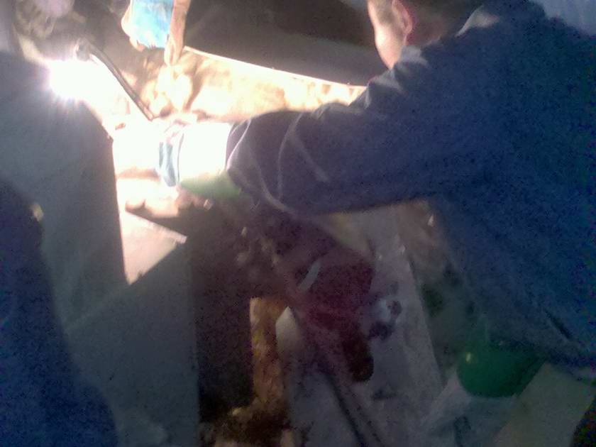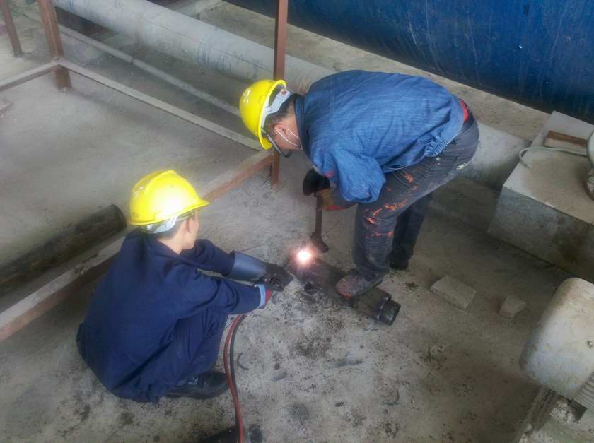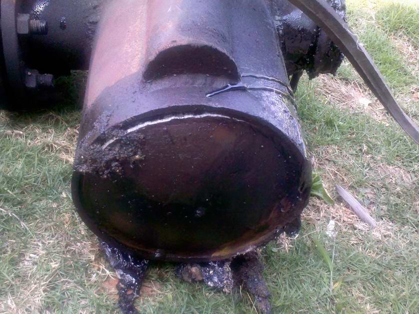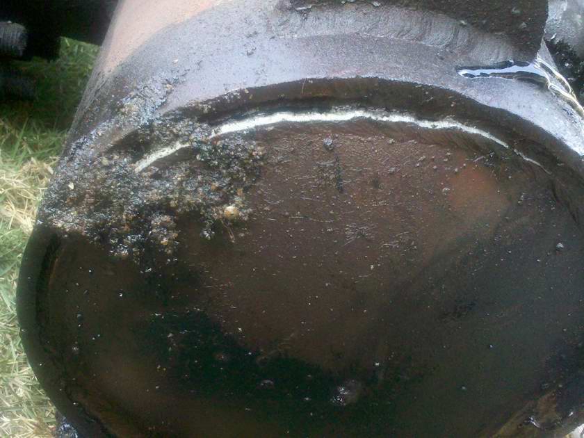 2013年3月11日晚6时巡查时发现2号生产罐沥青泵前过滤器漏导热油,当晚进行紧急处理。将保温全部拆开。   2013年3月12日晨将过滤器器拆除,发现底部焊接部位太薄,长期受压后从焊接处胀裂漏油。经生产部研究使用直通套管进行连接。下图为加工沥青管及焊接部位。