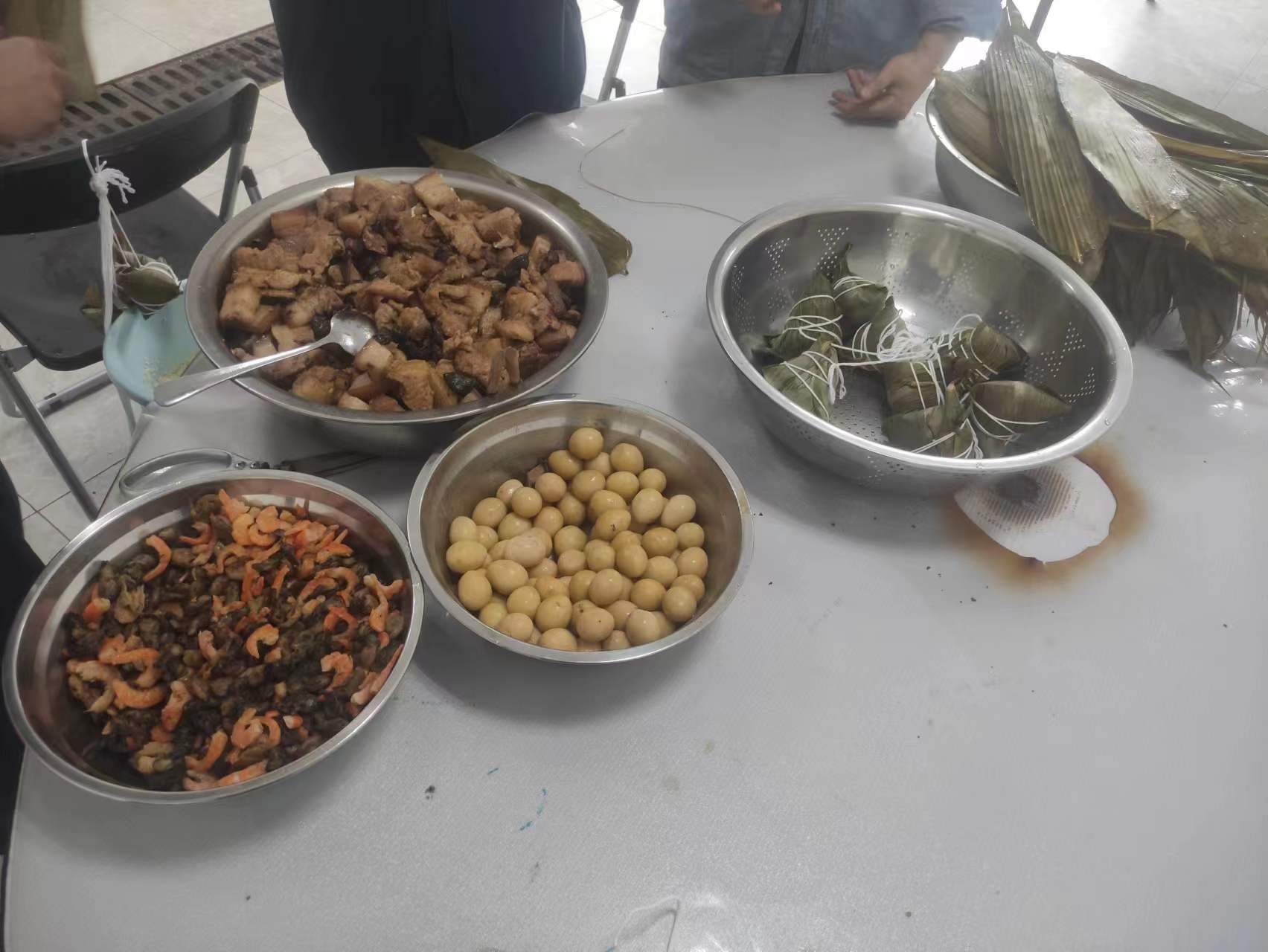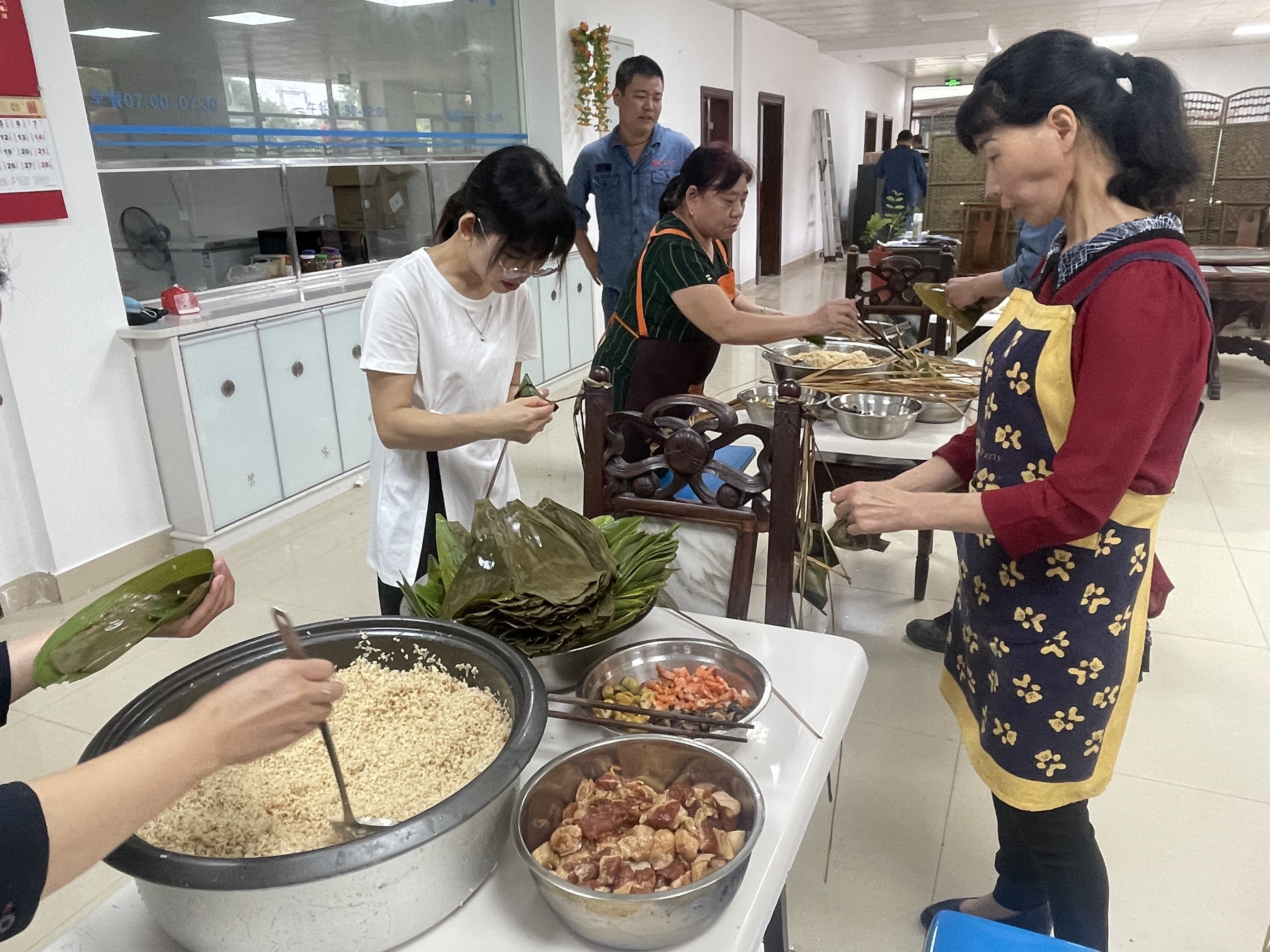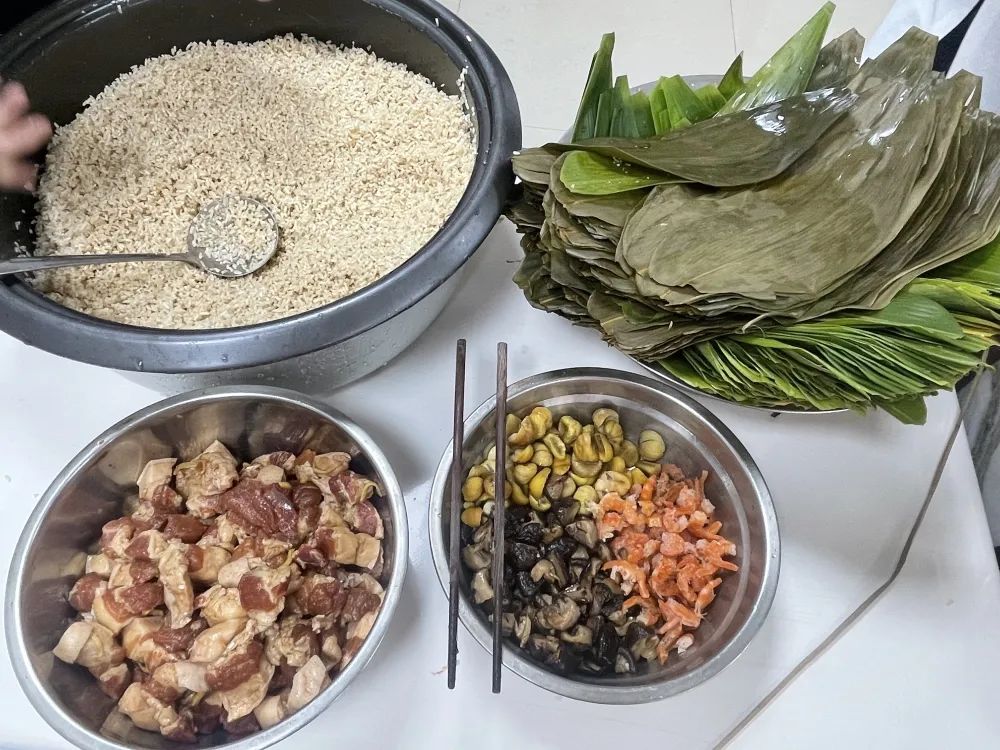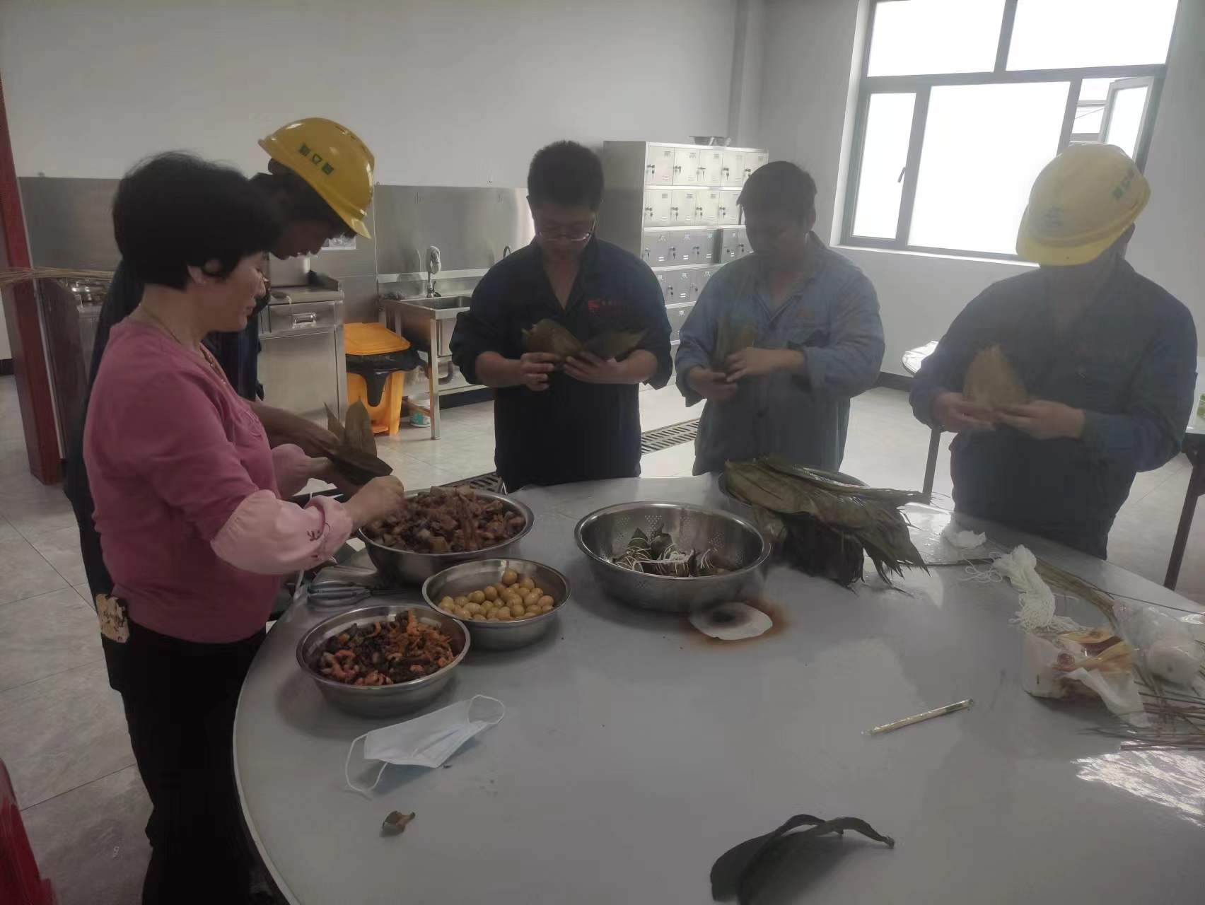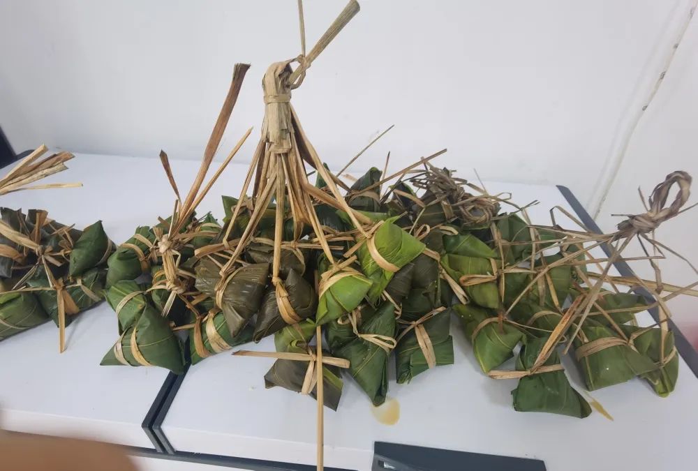一大早,食堂阿姨把提前泡好的糯米、竹叶、板栗、虾仁等材料整齐地摆放在桌子上。活动正式开始后,大家围在一起,纷纷使出看家本领。捋粽叶、做漏斗状、填糯米、压紧实、封口、扎捆,巧手翻飞,不一会儿功夫,长条形的漂亮粽子瞬间成型。大家一边包粽子,一边唠家常,一片融洽和谐。包粽子结束后,食堂阿姨把大家包好的粽子现场煮熟,热气腾腾的粽子上桌后,大家品尝着自己亲手包的粽子都赞不绝口。
