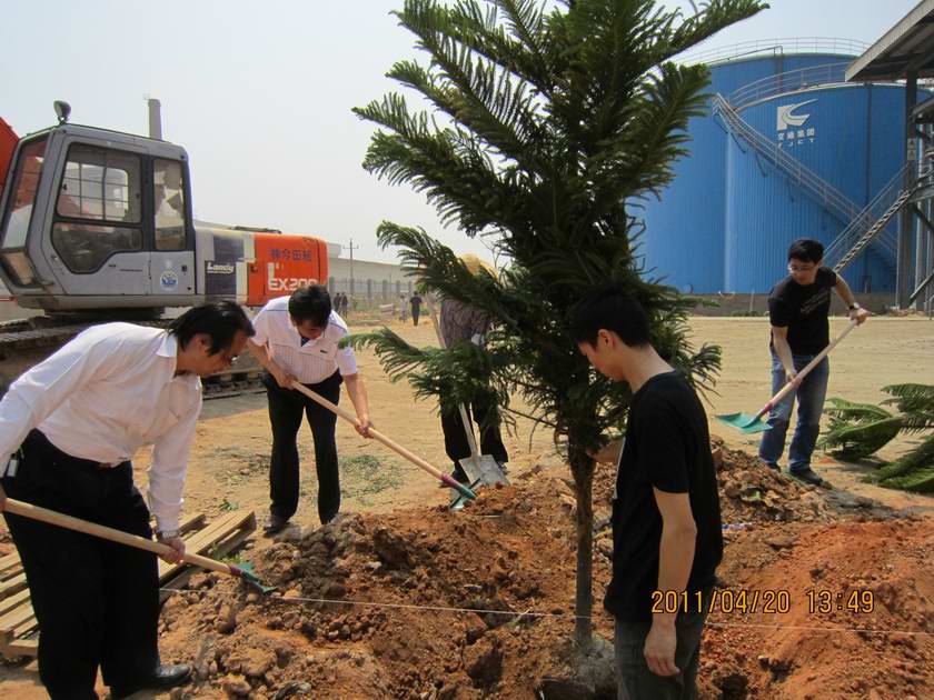 新立基公司朱勇进总经理、赣北公司王绪泉董事长等领导班子成员分别拿着锄头、铁铲和水桶等劳动工具,同40多名公司员工一起参加植树劳动。植树开始时,所有领导和员工一起三五成群,彼此分工,互相合作。有人在挖坑、有人在置苗、有人在培土、有人在浇水,大家的干劲都非常的高涨,充分享受着植树活动带来的乐趣。平时大家难得有这样的劳动机会,突然干起活来,难免有点笨手笨脚,可是这都没关系,大家累着并快乐着,植下一棵树苗就种下了我们希望的种子,通过大家一下午辛勤的劳作,共种下凤凰槐、南洋松、米兰、九里香等多样树种、树苗近200多颗,让空旷的厂区大道披上了美丽的绿装。