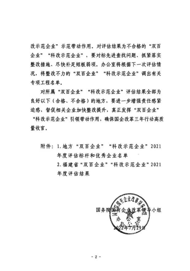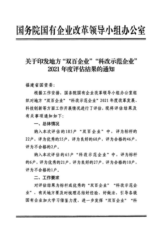 近日,国务院国有企业改革领导小组办公室公布对地方“双百企业”“科改示范企业”2021年度的评估结果。全国纳入本次评估的185家“双百企业”中,福建参评企业共七家,其中一家被评为“标杆”,两家被评为“优秀”。yl7703永利集团于此次评估中获评“优秀”。