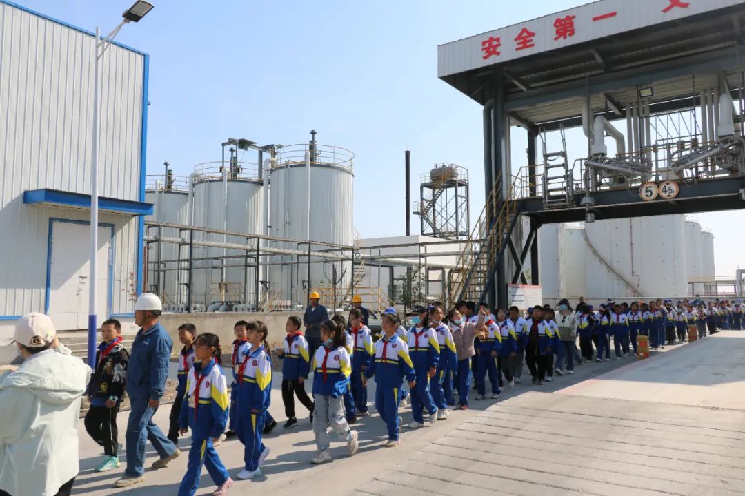 在新疆新立基生产部干部职工和学校老师们的带领下,同学们排着整齐的队伍,兴致勃勃地参观了基地内的沥青生产线,认真聆听生产部干部职工讲解沥青的来源和用途,用心感受基质沥青的接卸和改性沥青的生产过程,对产生疑惑之处积极地向现场工作人员进行提问。在参观过程中,也让同学们了解到在生产过程中注重生产效率的同时,需要保障沥青生产线的安全生产,引导青少年树立正确的劳动观念,加强安全意识。